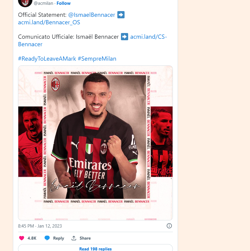 Ky vendim ka ardhur si dëshirë e drejtëpërdrejtë e trajnerit Pioli, i cili e vlerëson Bennacer në maksimum dhe e shikon si pjesë e projektit të së ardhmes.
